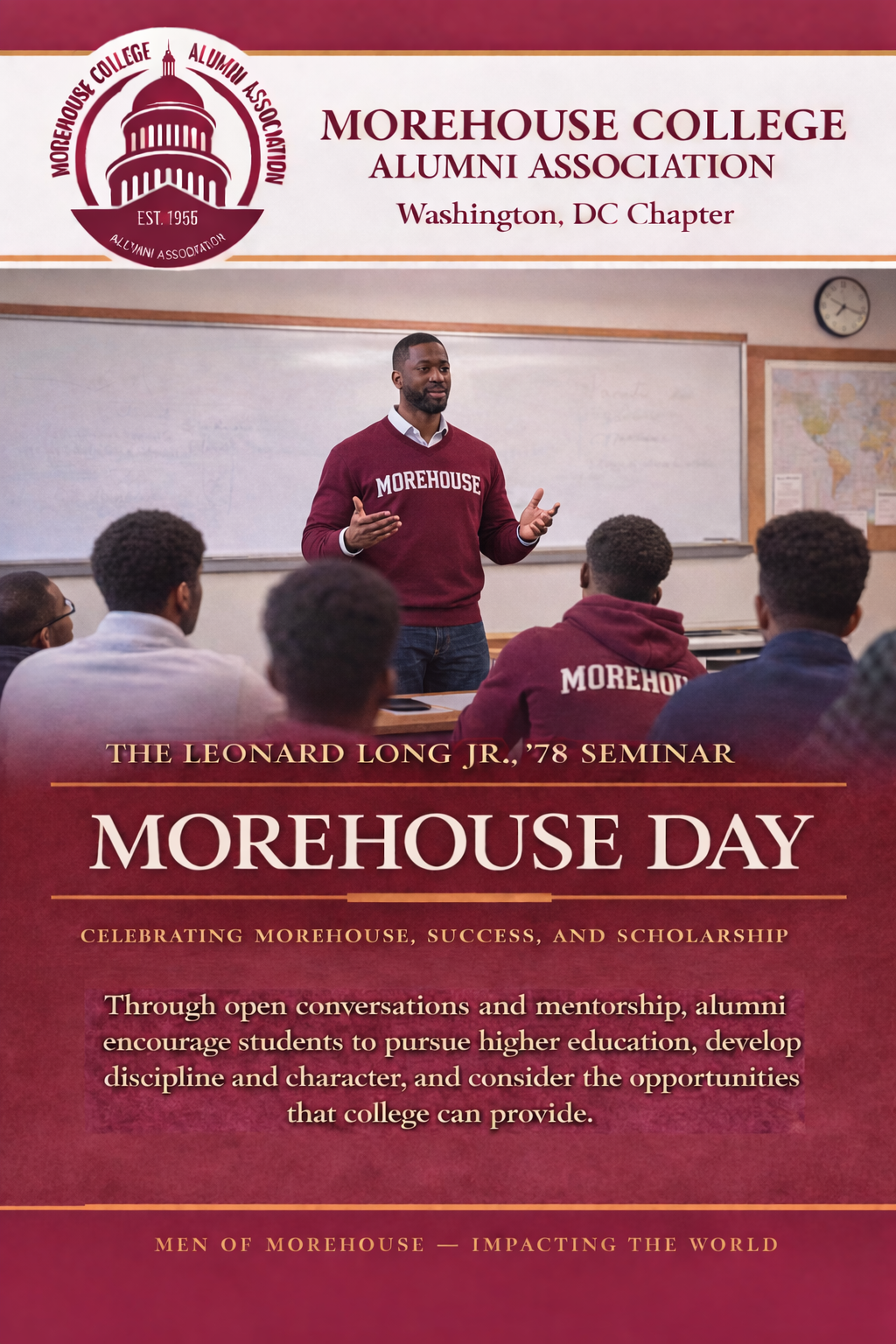 Join us for an upcoming Morehouse Day as DC Morehouse alumni visit a local DMV school to speak with students about the transformative experience of attending Morehouse College. Alumni will share personal journeys, leadership lessons, and insight into academic programs, brotherhood, and opportunities available at Morehouse.